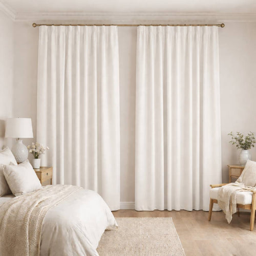 Light-toned blackout curtains that maintain a soft, airy feel while delivering complete darkness.